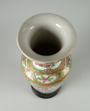 A NINETEENTH CENTURY PORCELAIN FAMILLE-ROSE VASE with tapering and flared neck, decorated with opposing panels, 26cms high