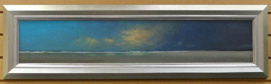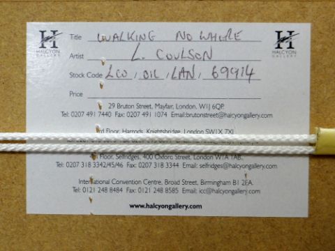 LAWRENCE COULSON oil on board - expansive beach with solitary distant figure and colourful far-off houses, entitled verso 'Walking Nowhere', signed, 18 x 99cms