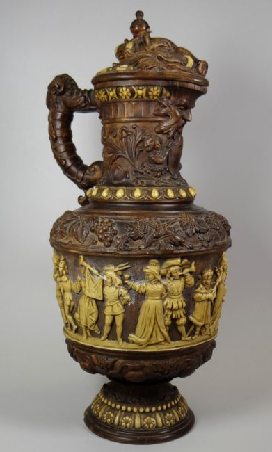 A GERMAN GOTHIC REVIVAL SALT-GLAZED POTTERY WINE EWER, circa 1880/1890 relief decorated all round and having a boar's head lid, ram's head handle, the neck with Bacchus and figures with shield, the body with a continuous band of revelers and musicians, on a circular base and a band of grapes on vine, no impressed marks except '69', 53cms high (with lid)