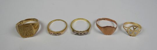 FIVE VARIOUS GOLD RINGS including two 18ct diamond half-hoop engagement rings, 5.1gms a 9ct monogrammed signet ring, 8gms etc