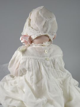A GERMAN BISQUE HEAD DOLL BELIEVED BY HERTEL SCHWAB No. 152, having rolling eye-lids, open mouth, sensitively painted cheeks and with composition body and limbs, in white cotton nightgown, 40cms high