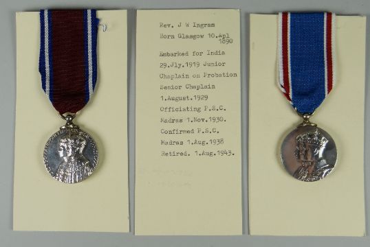 GEORGE V & QUEEN MARY SILVER JUBILEE MEDAL together with George VI coronation medal, both engraved to Rev. J W Ingram PSC Madras (with printed information card)
