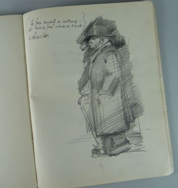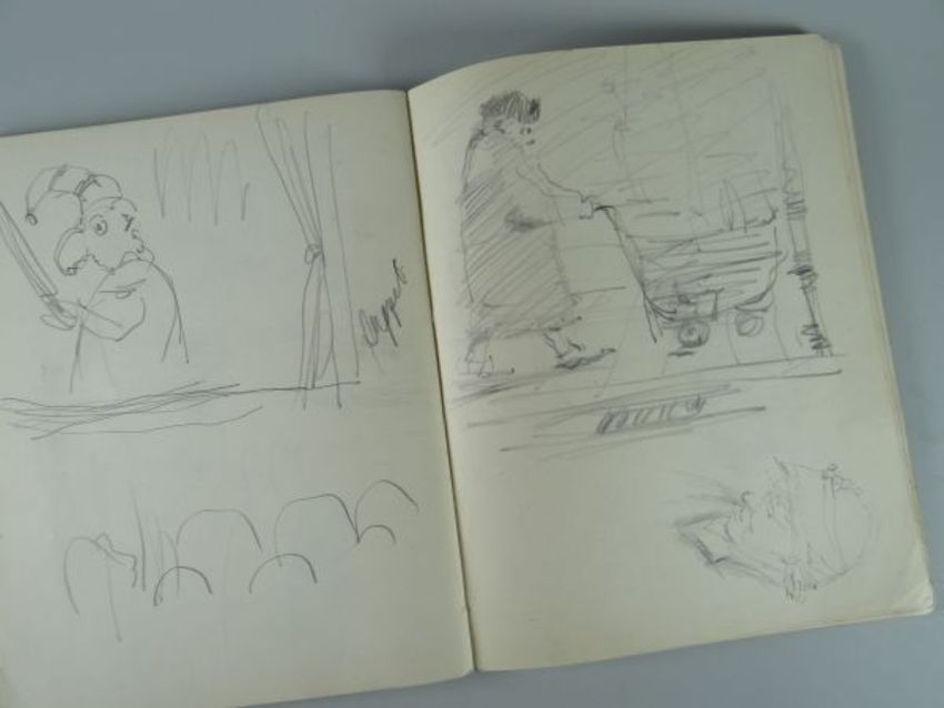 THREE HARDCOVER SMALL BLACK EXERCISE-TYPE BOOKS WITH SKETCHES