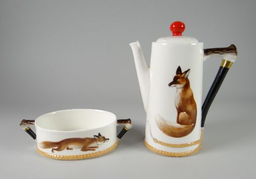 A RARELY SEEN ROYAL DOULTON 'REYNARD THE FOX' COFFEE-SET comprising coffee pot, six demitasse & saucers and twin-handled basin, all with riding-crop handles having a rope terminal which circles the base of each element, each decorated with relief fox to each, H4927