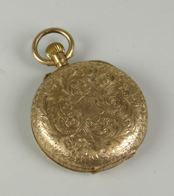 A 14K YELLOW GOLD ENGRAVED FOB WATCH with yellow dial bearing Roman numerals, 26gms total