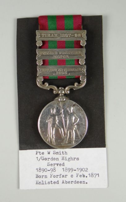 INDIA MEDAL 1895 with three clasps Tirah 1897-98, Punjab Frontier 1897-98 & relief of Chitral 1895, engraved to Private W Smith (with printed information card)