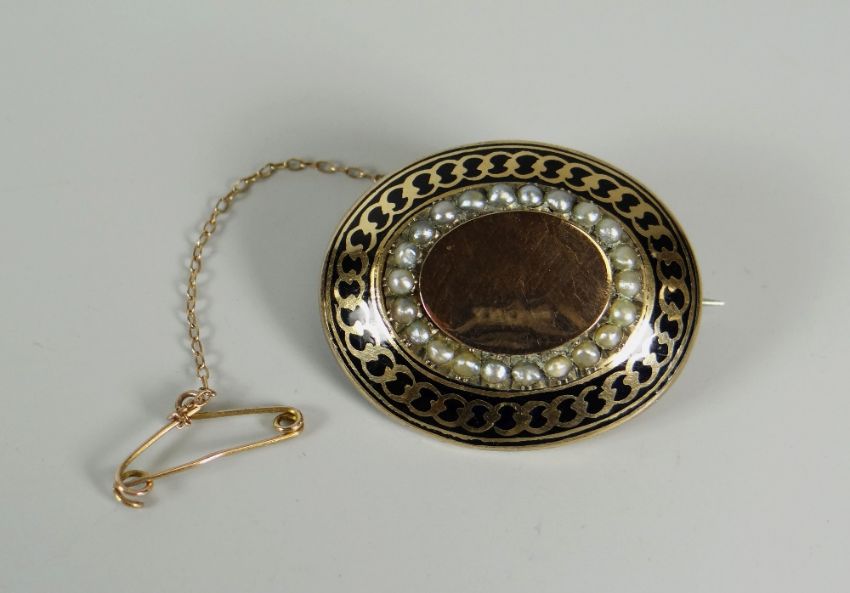 A VICTORIAN MOURNING BROOCH of oval form in enamelled 9ct yellow gold, set with seed-pearls, in believed original Elkington & Co box,