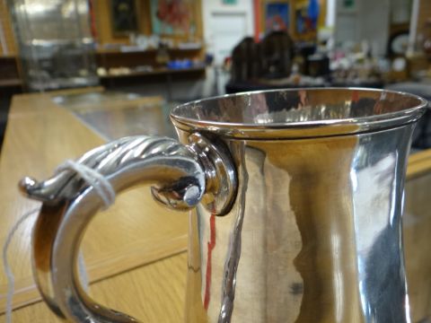 A GEORGE III SILVER TANKARD bell-shaped with spreading circular foot, scrolling feathered handle, London 1787, mark for Charles Hougham, 13.5cm high, 11.3ozs