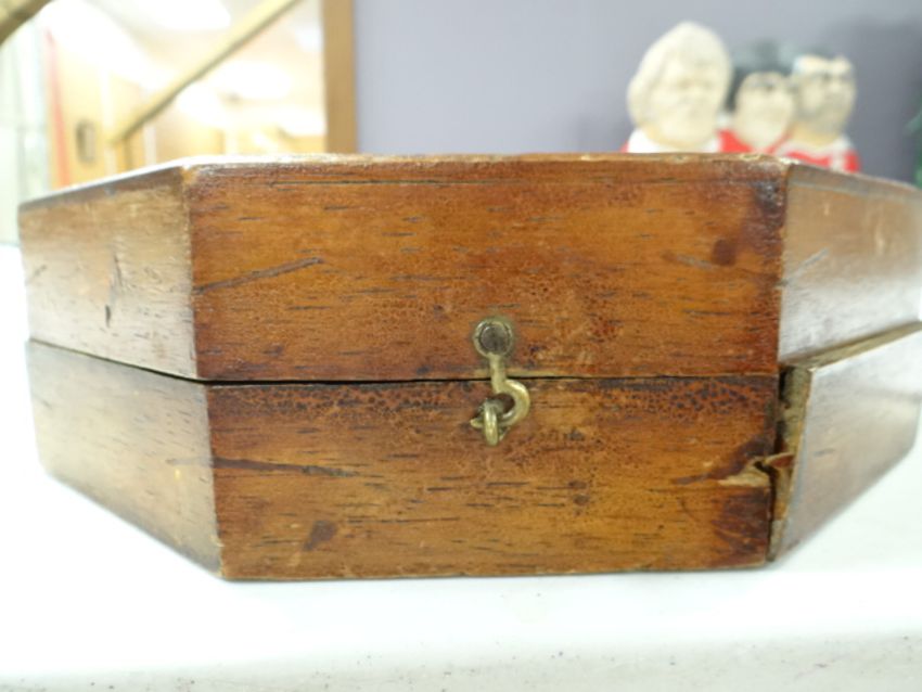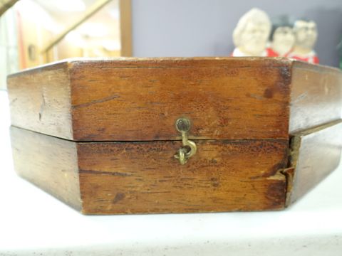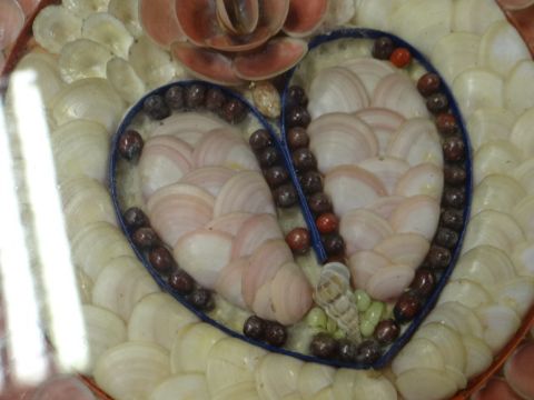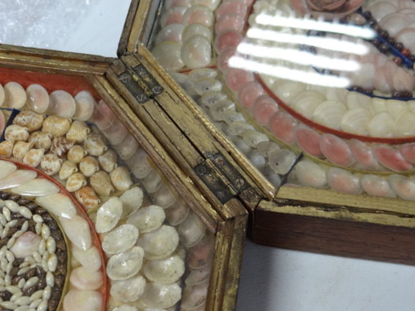 A VICTORIAN SAILOR'S VALENTINE SHELLWORK SOUVENIR with two-sides, the colourful shells contained within hinging octagonal glazed encasement, one side with heart design within circles, the other side with 'A Present from Barb'o's', 23cms acrosscondition:The box is a little worn in places. It does not hold closed properly and there are a few shells missing