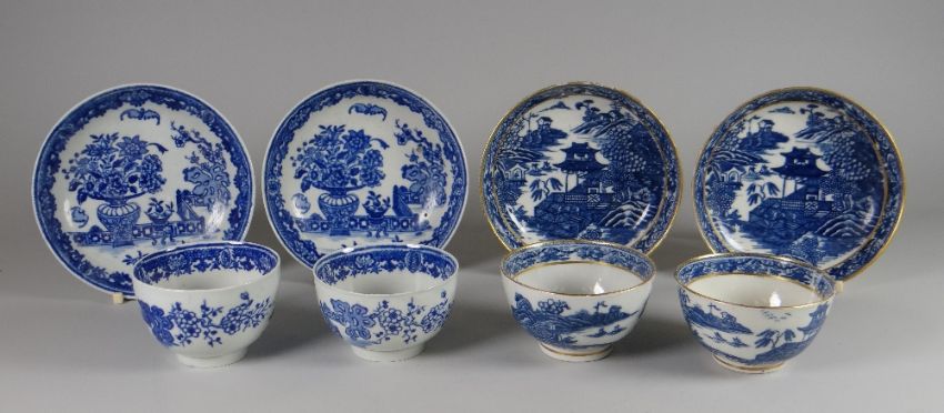 A PAIR OF 1ST PERIOD WORCESTER TEA-BOWLS & SAUCERS together with a pair of similar with gilt rims