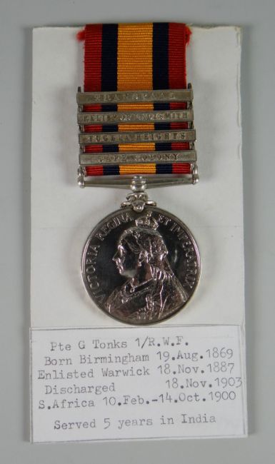 QUEEN'S SOUTH AFRICA MEDAL with four clasps Transvaal, Relief of Lady Smith, Tugela Heights & Cape Colony, engraved to 2059 Private G Tonks R Welsh Fusiliers (with printed information card)