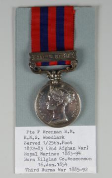 INDIA GENERAL SERVICE MEDAL 1854 with clasp Burma 1885-87, engraved to Private P Brennan RM (Royal Marines) HMS Woodlark
