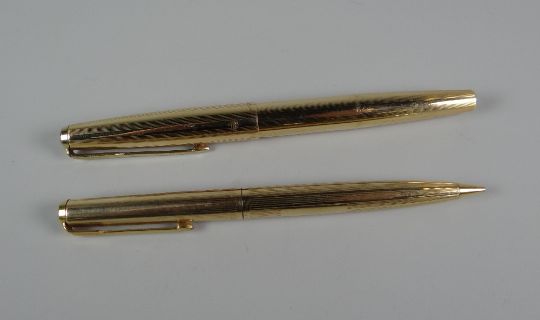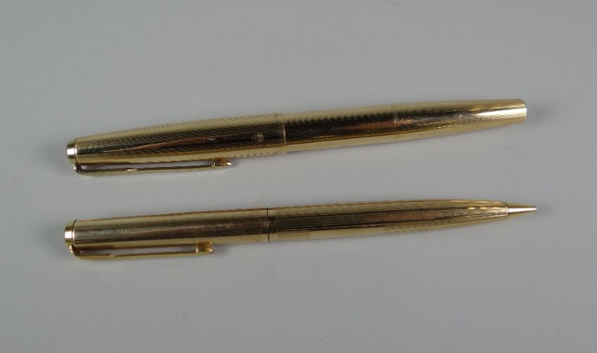 VINTAGE PARKER 61 ROLLED GOLD FOUNTAIN PEN & MECHANICAL PENCIL with engine-turned decoration & double jewel
