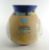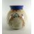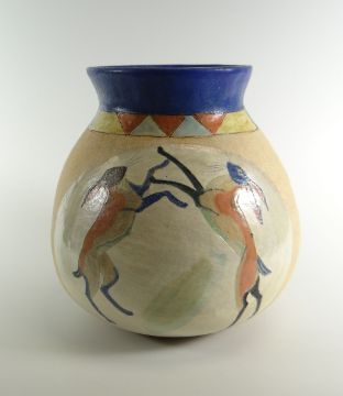 JILL FANSHAWE KATO stoneware vase of bulbous form with pastel coloured geometric decoration, deep blue neck and a panel depiction of a pair of boxing hares, 21cms high, signed / stamped