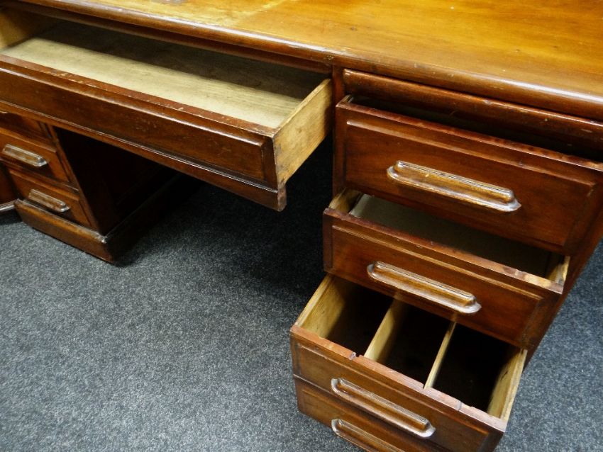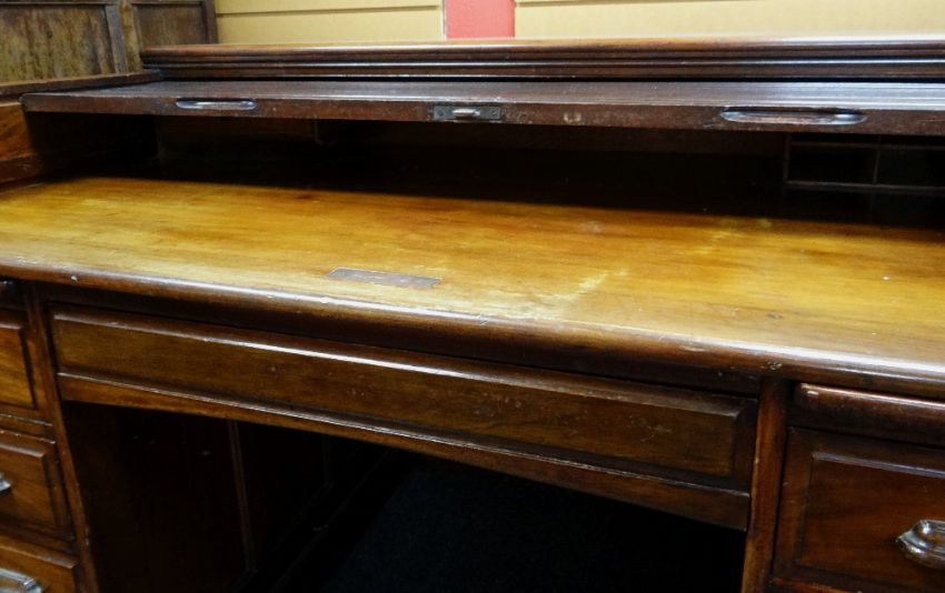 A ROLL-TOP DESK with low tambour, four single drawers to left bank, three single and one double filing drawer to right, compartment interior, 151cms wide