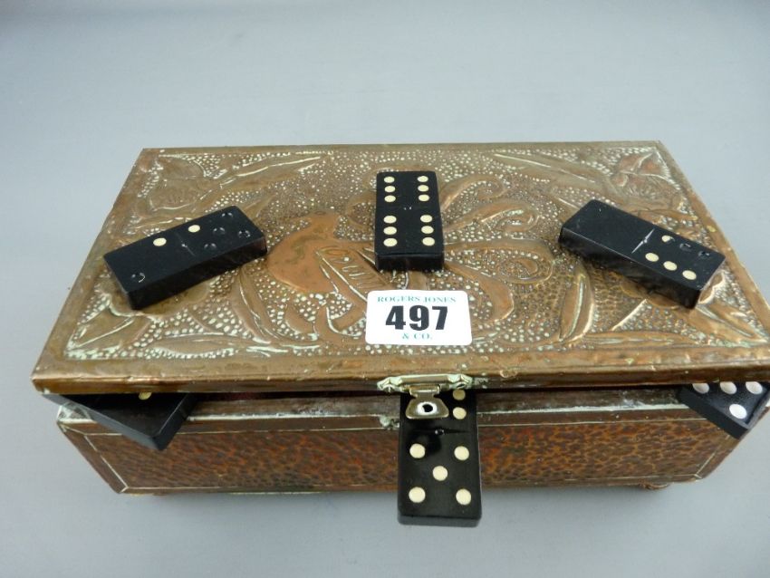 Copper repousse decorated box containing a quantity of plastic dominoes