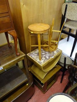 Oak magazine rack/coffee table, a vintage 'X' frame seat and two matching circular plant stands
