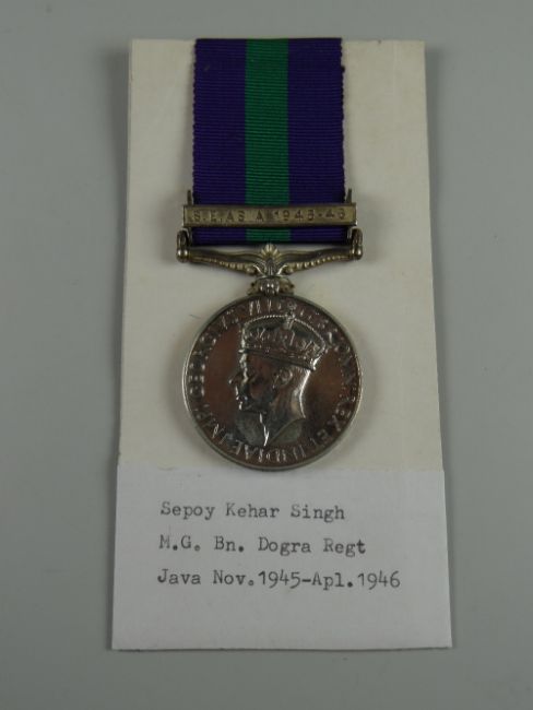 GEORGE VI GENERAL SERVICE MEDAL with single clasp S E Asia 1945-46, engraved 9935 Sepoy Kehar Singh M.G. BN DOGRA. R. (with printed information card)(all medals to be bought as seen, condition reports available until 7pm Thursday 7th June)