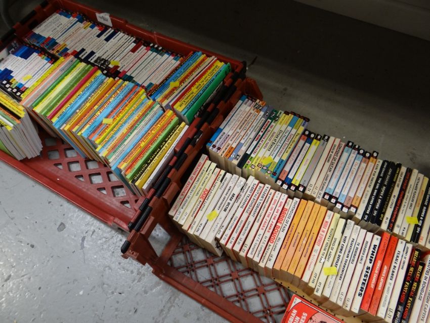 Two crates of paperback books & erotic magazines, largely relating to bondage