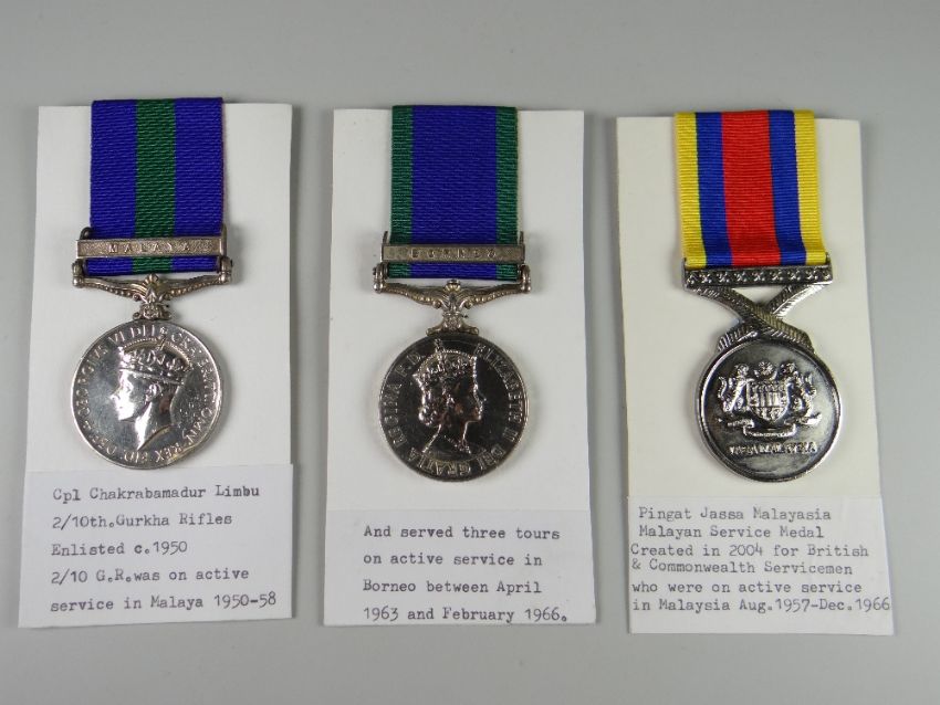 GEORGE VI & ELIZABETH II GENERAL SERVICE MEDALS with Malaya & Borneo clasps, engraved Chakrabamadur Limbu Gurkha rifles together with Pingat Jassa Malaysia Service medal (with printed information cards) (3)