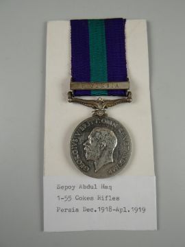 GEORGE V GENERAL SERVICE MEDAL with single medal clasp SS Persia, engraved to 4989 Sepoy Abdul Haq 1-55 Coke's rifles (with printed information card)(all medals to be bought as seen, condition reports available until 7pm Thursday 7th June)