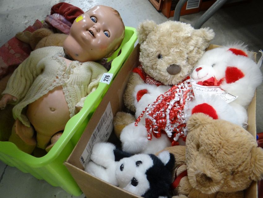 A doll together with a collection of cuddly toys