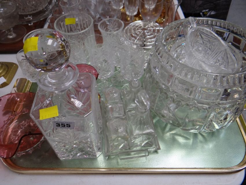A tray of various mainly cut glass including decanter, drinking glasses, large fruit bowl etc
