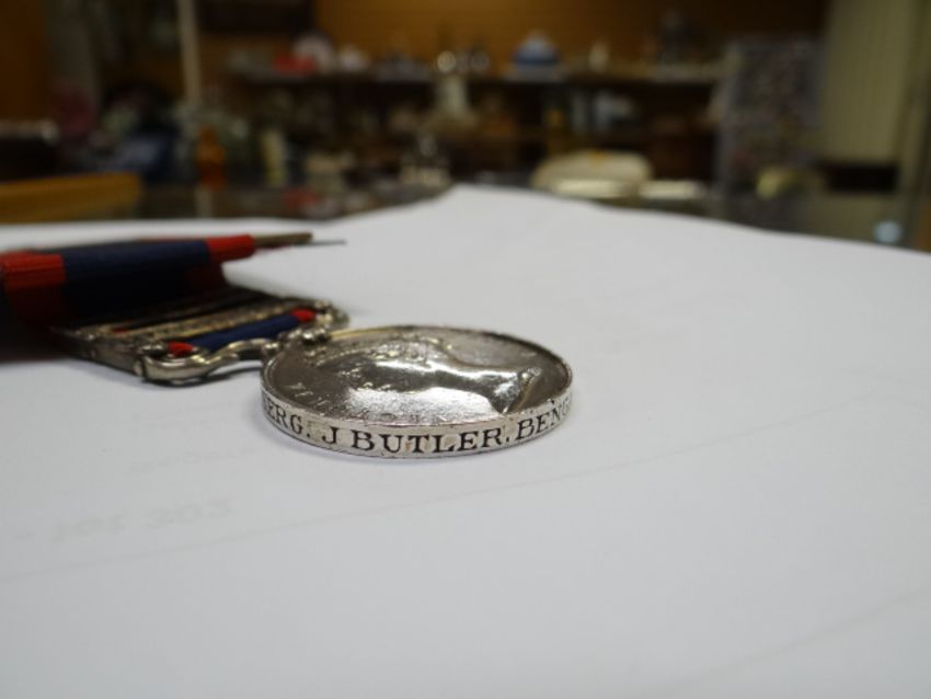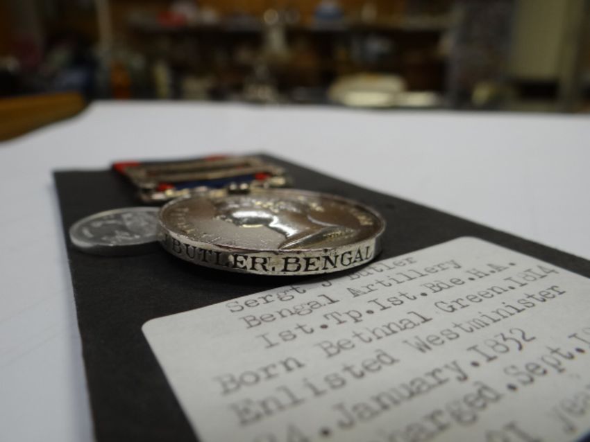 SUTLEJ MEDAL having two clasps Sobraon & Ferozeshauhur, engraved to Sgt. J Butler, Bengal Artillery, together with 1/12th Anna coin & Army of the Sutlej token (with printed information card) (later inscribed)(all medals to be bought as seen, condition reports available until 7pm Thursday 7th June)