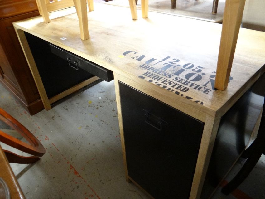 A large modern office desk with metal cupboard & drawer