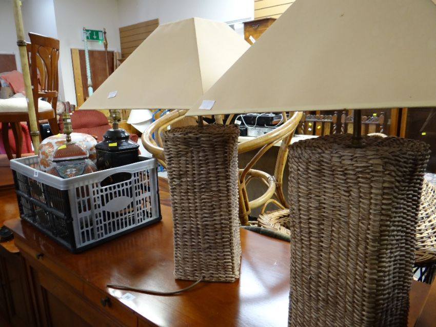 A parcel of various ceramic & wicker effect table lamps together with a bamboo effect standard lamp