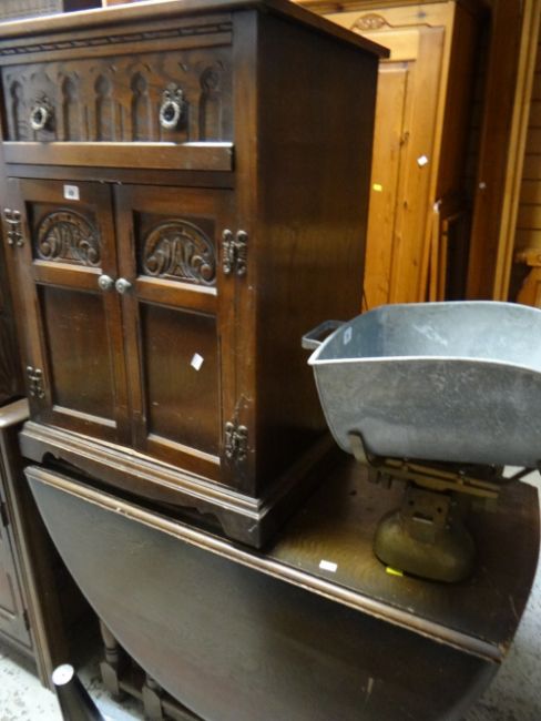 An oak drop leaf dining table together with an oak carved decorated cabinet