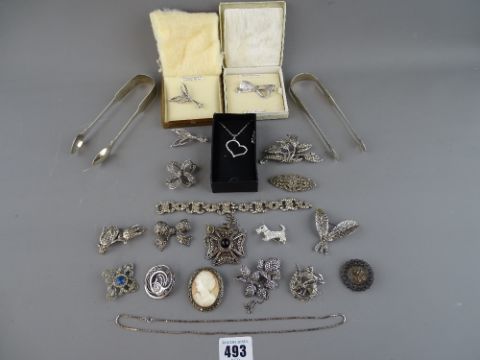 Antique and later marcasite set jewellery, stylized silver and Victorian brooches along with two pairs of silver sugar tongs