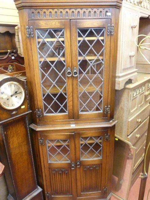 Priory style corner cupboard with twin leaded and glazed upper doors and base doors