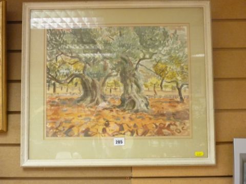 JANE GLASFORD watercolour - titled 'Olive Trees, Ibiza' with price seven guineas
