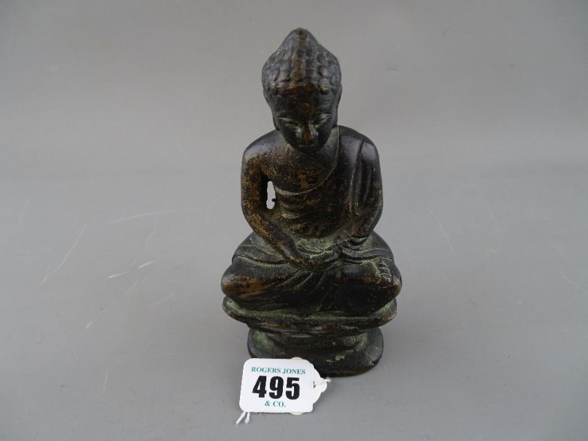 Antique Oriental bronze figure of Buddha in meditation pose upon a lotus leaf base