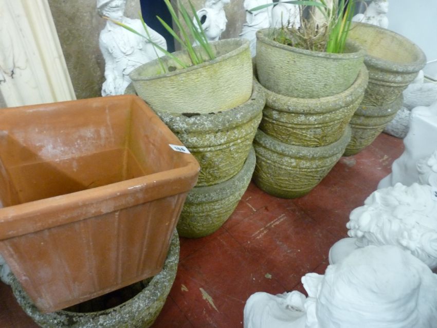 Parcel of ten circular garden stone planters and one square