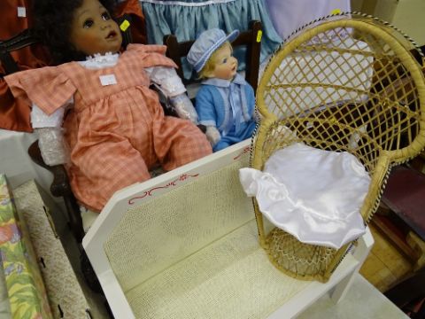 Black doll with pink check type dungarees seated on an elbow chair, a baby boy doll in blue outfit seated on a chair and a doll's white bench and peacock straw chair