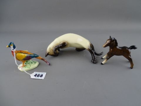 Two Beswick animal ornaments and a pottery pheasant