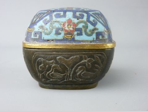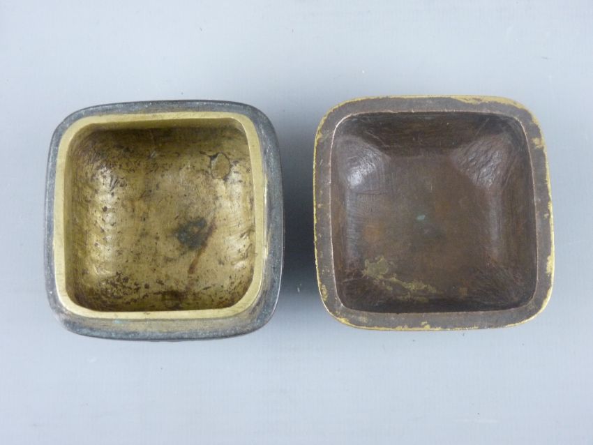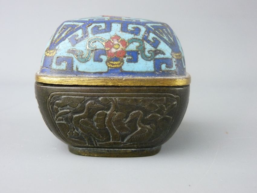 AN ORIENTAL BRONZE & CHAMPLEVE ENAMEL BOX & COVER, the base section having panels of birds and animals, 6 cms high, 7 cms square
