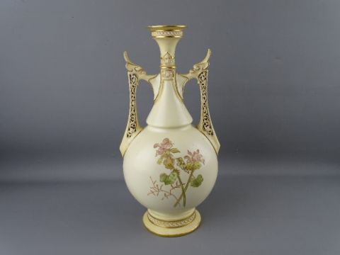 A ROYAL WORCESTER 1071 PATTERN TWIN RETICULATED HANDLED VASE having floral sprays in gilt relief, 35.5 cms high