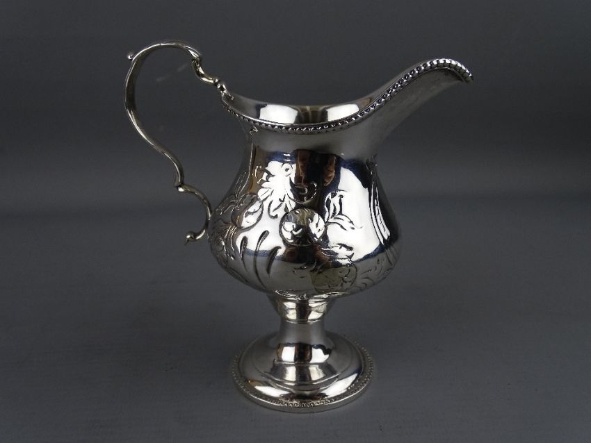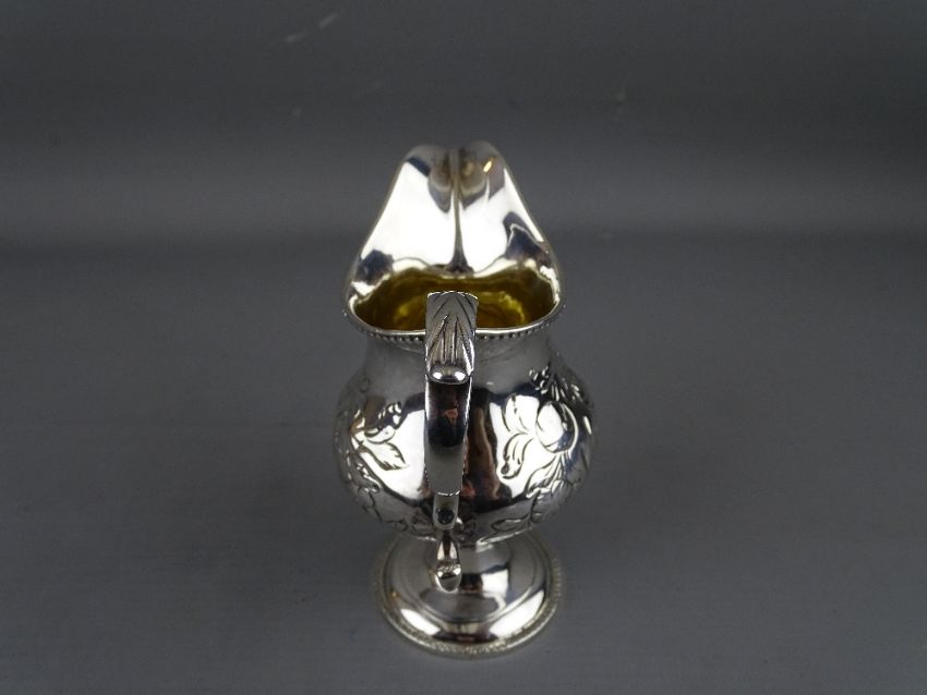 A CLASSICALLY STYLED SILVER PEDESTAL CREAM JUG with embossed floral decoration and gilt interior, Norwich assay, date letter rubbed, 4.2 troy ozs
