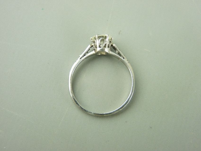 A PLATINUM DRESS RING with round cut diamond solitaire set in shoulders with tiny diamonds, 0.8 carat visual estimate, size 'M/N', 2.5 grms