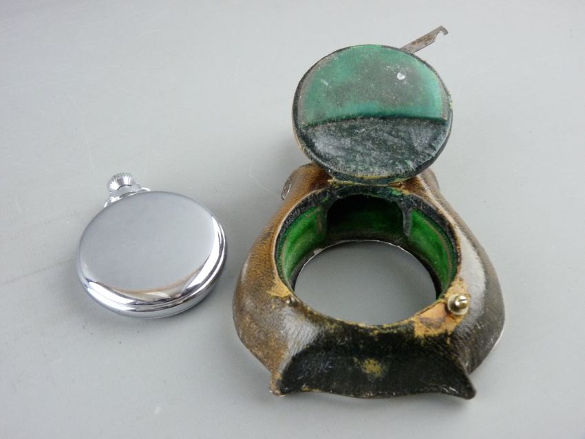 A SILVER MOUNTED LEATHER EASEL POCKET WATCH STAND, Birmingham 1902