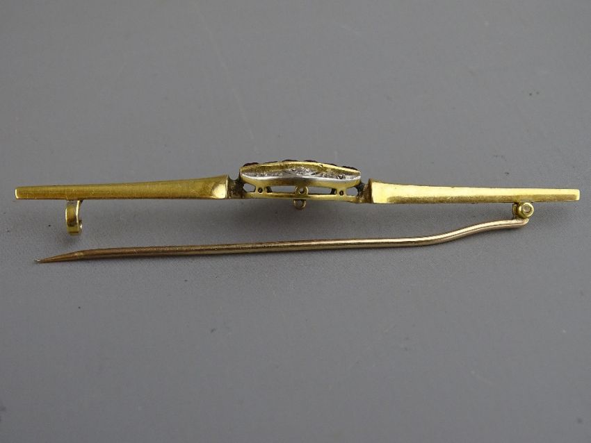 AN UNMARKED GOLD BAR BROOCH the oval centre having tiny diamonds in heart shaped and other settings under a band of six tiny oblong cut rubies, 6 grms total