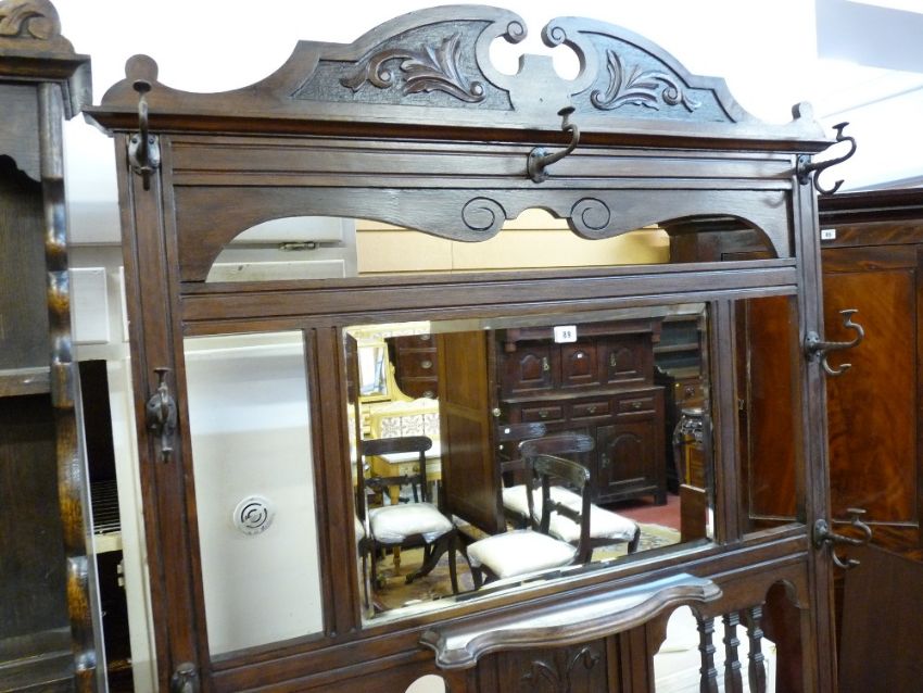 AN EDWARDIAN MIRRORED HALLSTAND, 211 cms high, 111 cms wide, 32 cms deep (no drip trays)