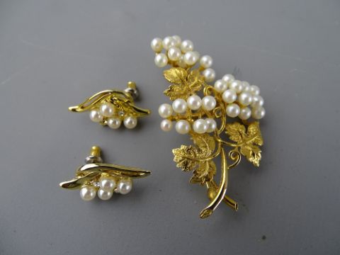A NINE CARAT GOLD LEAF BROOCH, 8.6 grms, London 1910, encrusted with thirty one pearls and a pair of similar but non-matching earrings, 2.3 grms