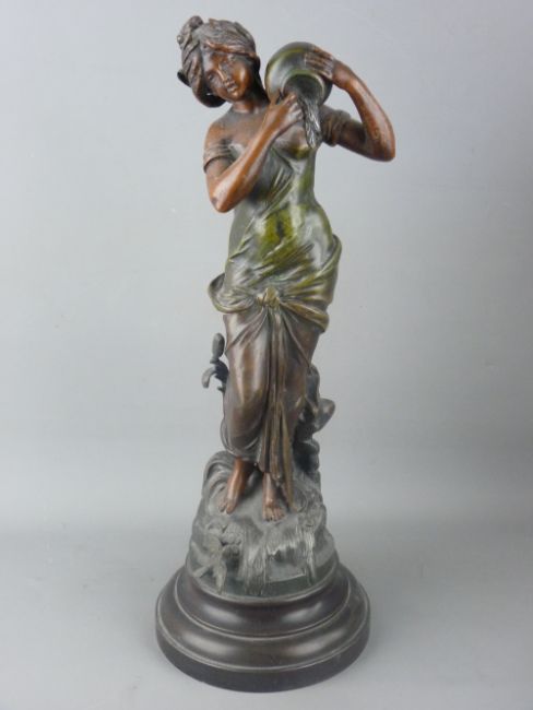 THREE PAINTED SPELTER FIGURINES OF YOUNG MAIDENS in various poses, 53 cms high the tallest, all raised on circular socle bases