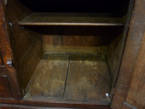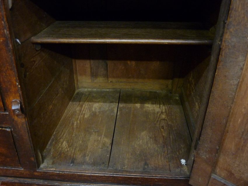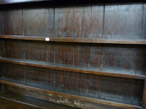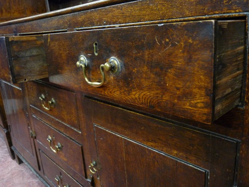 AN EARLY 19th CENTURY OAK FRONT DRESSER, the base section having fully opening pine lined drawers and brass swan neck handles, 197 cms high, 152 cms wide, 52 cms deep