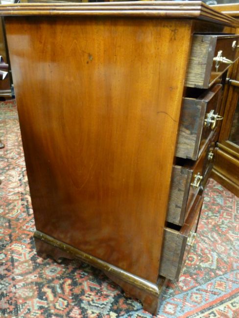 A NEAT MAHOGANY PEDESTAL DESK with kneehole cupboard centre and oak lined drawers, 77.5 cms high, 83.5 cms wide, 45.5 cms deep