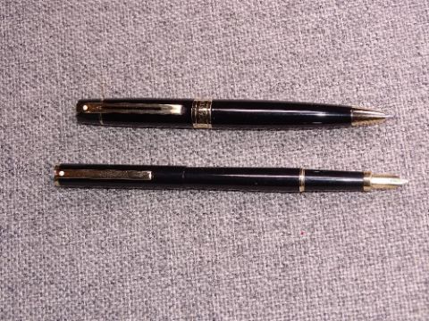 Modern Black Sheaffer 300 ballpoint pen with chrome trim. Modern Black Sheaffer Fashion I fountain pen with gold plated trim and nib